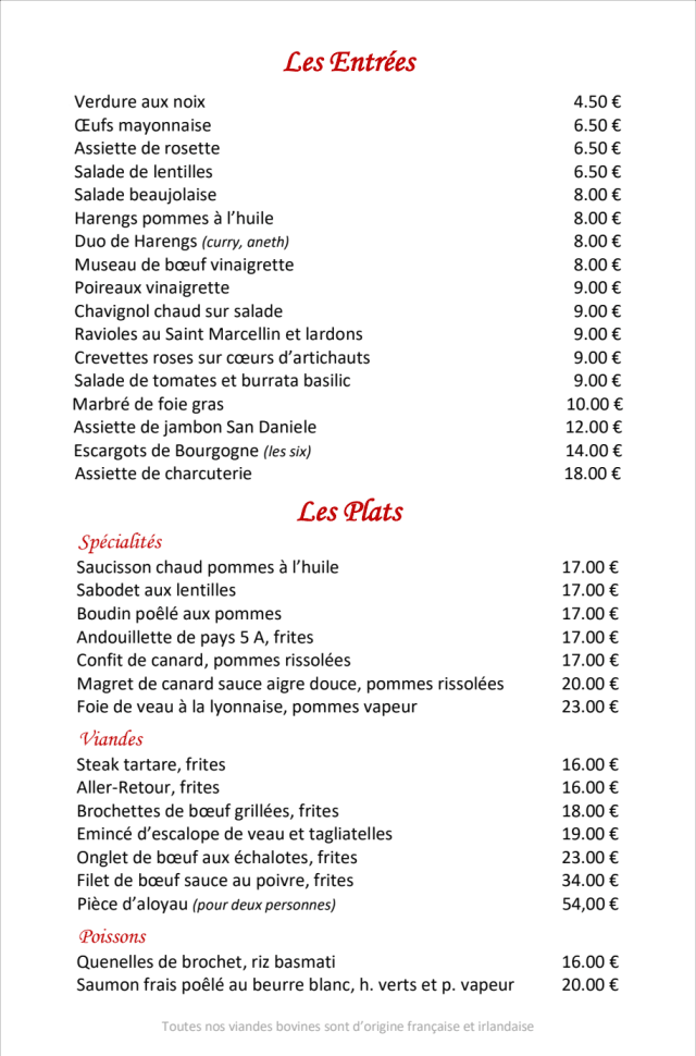 10/10Excellent service, great traditional French cooking, well served, simply and generously. No stupid pseudo arty stuff, the steaks are thick and half the size of the plate, cooked as you asked, the chips are real potato chips perfectly fried, and the sauces hearty and savory. The wine list is affordable and well chosen. If you take a glass, it is a full glass, not the aesthetically half empty version in other places, and you have the choice of carafe sizes as well. Deserts are classic French stuff, the tarte de jour is always a winner. At linchj today, we finished with glasses of an excellent brandy, I've eaten here many times, and have always been very happy with the experience.