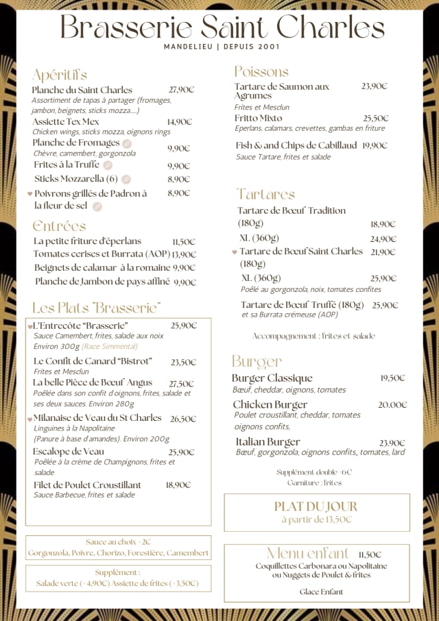 Sur le site du centre commercial Esterl Gallery à Mandelieu-La-Napoule la Brasserie Saint Charles vous accueille dans un cadre moderne et lumineux. Une équipe jeune et sympathique sera aux petits soins pour faire passer un agréable moment. Il vous sera proposé les incontournables d´une carte brasser...
