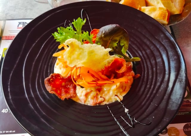 Crème de comté 12 mois, lard grillé, tomates et oignons confits