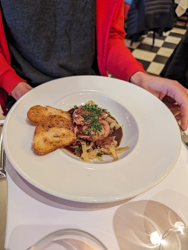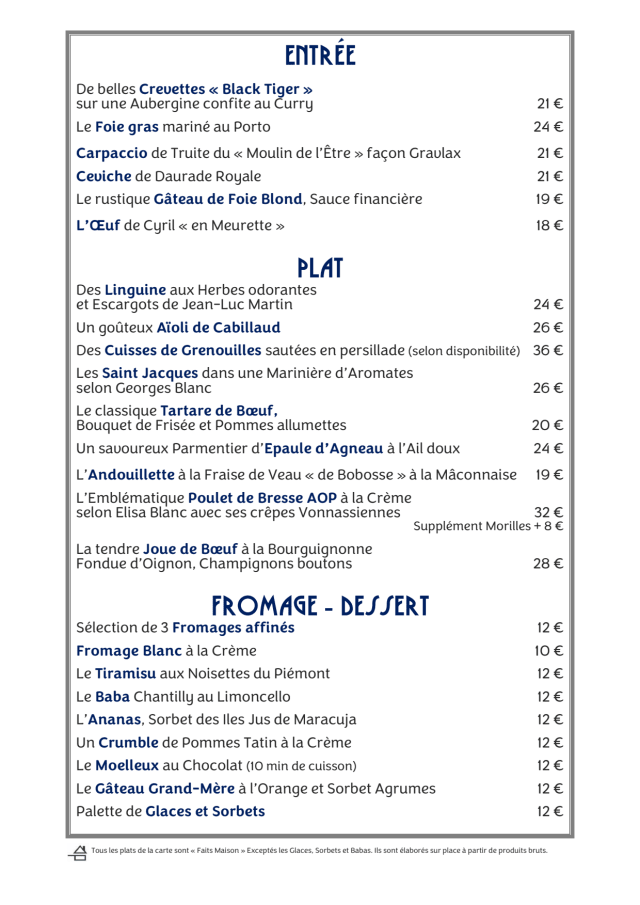 10/10We are a well travelled couple who have eaten in many top class restaurants and frankly this was superb. The setting by the Saone river was delightful but the food was the star. My wife had Les Œufs de la Ferme du Père Pagneux « en Meurette » and I had the Salad de Quai both of which were wonderful. The best was yet to come with the lamb for me and the poulet de bresse for my wife which were both superb. Excellent local St Veran wine to complete a perfect evening. This is an exceptional restaurant by any measure.