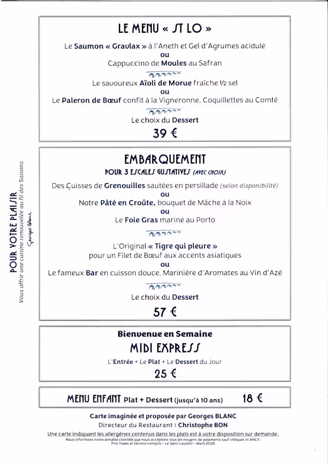 We are a well travelled couple who have eaten in many top class restaurants and frankly this was superb. The setting by the Saone river was delightful but the food was the star. My wife had Les Œufs de la Ferme du Père Pagneux « en Meurette » and I had the Salad de Quai both of which were wonderful. The best was yet to come with the lamb for me and the poulet de bresse for my wife which were both superb. Excellent local St Veran wine to complete a perfect evening. This is an exceptional restaurant by any measure.