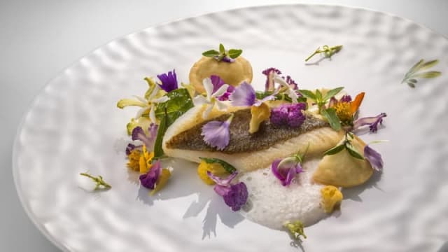 - Juste poêlé, maïs crémeux, rhubarbe au vinaigre de Jerez