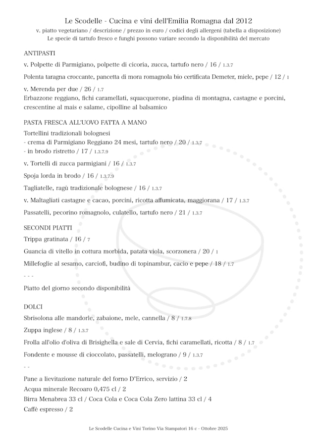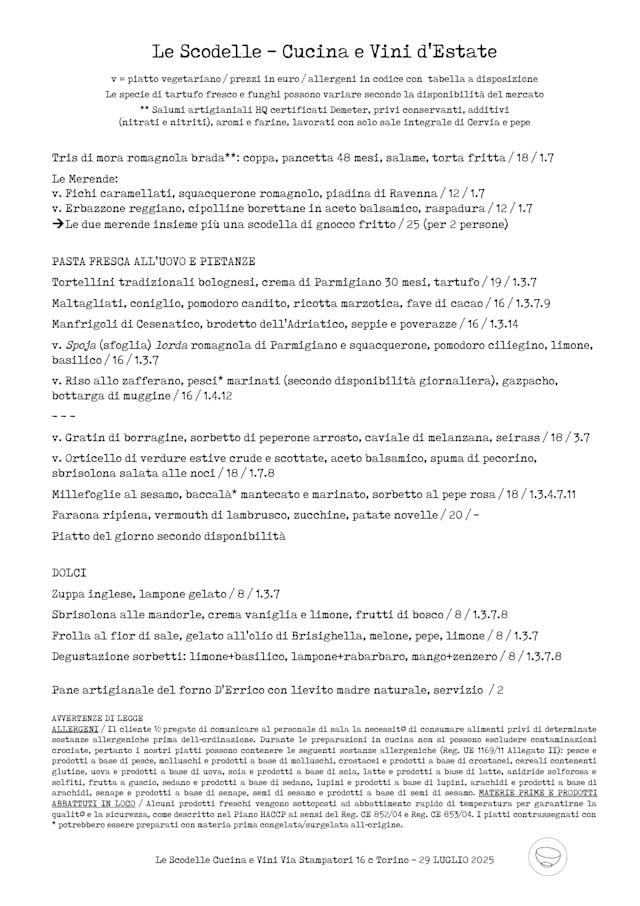 8.5/10Le Scodelle Restaurant: A Quaint Gem in Torino Nestled in the heart of Torino, Le Scodelle is a charming culinary retreat that invites you into its cozy embrace. This quaint eatery stands as a testament to the old-world charm of Italian dining, where simplicity meets quality in a delightful union. PROS: Cozy Ambiance: The moment you step inside Le Scodelle, you are welcomed by a simple, yet warm and inviting decor. The intimate setting is perfect for a romantic date night or a cozy gathering with friends and family. Artisanal Charcuterie: Le Scodelle takes pride in its selection of quality cold meat cuts sourced from small local producers. The attention to detail and commitment to showcasing regional flavours are evident in every bite. Seasonal Sensibility: One of the restaurant's standout features is its ever-evolving menu. Drawing inspiration from the season's freshest ingredients, diners can expect a culinary journey that reflects the true essence of Italian cuisine. Regional Wine Selection: Wine enthusiasts will appreciate the restaurant's well-curated collection of wines hailing from Emilia-Romagna. The perfect accompaniment to your meal, these wines add a delightful dimension to your dining experience. Heartwarming Service: Le Scodelle is not just a place to eat; it's an experience. The service here is characterized by the hospitality and warmth of two lovely ladies who make you feel right at home. Their attentive care and personalized touch elevate the overall dining experience. CONS: Persistent Disturbance: While Le Scodelle offers a peaceful and charming atmosphere, some patrons have been inconvenienced by persistent flower vendors. It's disheartening to have the romantic ambience disrupted multiple times during a two-hour dinner. It does leave one wondering why the restaurant does not take measures to address this issue, such as prohibiting the vendors from approaching diners. In conclusion, Le Scodelle is a delightful small restaurant in Torino that holds true to the essence of Italian dining. With its cozy setting, artisanal charcuterie, seasonal menu, and excellent service, it promises a memorable experience. However, the disturbance caused by flower vendors is a minor hiccup that could potentially affect the overall dining experience. Nonetheless, if you're in search of an intimate, charming dining experience in Torino, Le Scodelle is certainly worth a visit.
