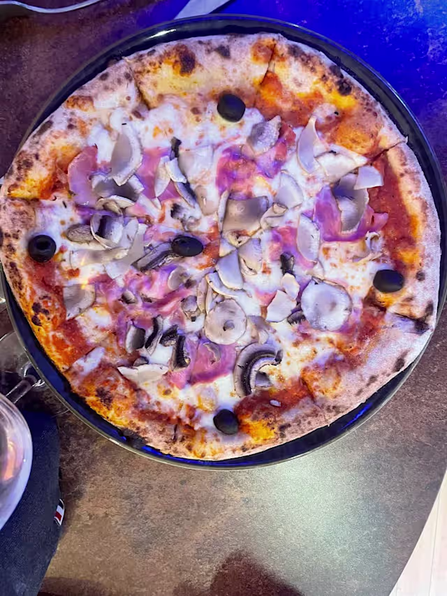 - Tomate, mozzarella fior di latte, jambon blanc, champignons, olives noires