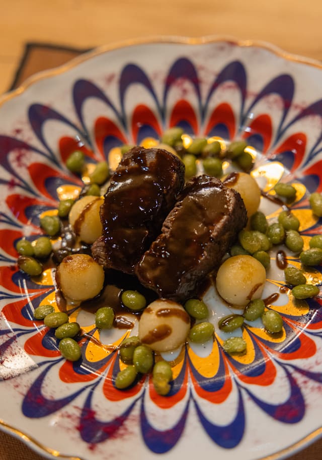 - Filet de bœuf, pommes noisette, fèves sautées