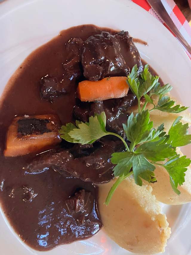 - Joues de boeuf braisées au vin rouge et carottes glacées, pommes purée