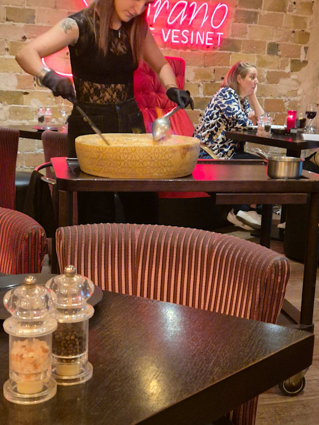 8.5/10I reserved a table for Friday night to treat my man to a romantic night for two. We were pleased to find a really cool vibe when we arrived. The waitresses were dressed in tight black mini dresses and knee high boots. Super sexy which my man really liked. The guys were not dressed sexy, which I felt was a bit unbalanced. The interior was warm with good lighting and sexy red accents. When we first arrived, the place was empty. Within an hour it was packed with a line out the door. Make sure to reserve. I ordered the signature dish, ravioli with lobster. My boyfriend ordered the pasta with parmesan with truffles although he said not put truffles on it. My dish was pretty and tasted good. My boyfriends was just a pile of noodles with white sauce, very unappealing to look at and not much flavor. I realize he didn't want truffles but they could have put parsley on top with a few shavings of parmesan to give it more appeal. My man is an excellent cook and really enjoys a well decorated plate. I switched with him because I could see the disappointment on his face. I lied and told him I like his dish better. than mine. He gobbled mine and I could hardly eat his. After three bites I was bored. Everyone around us was ordering pizza. They seemed to be enjoying their meal. My boyfriend was enjoying himself which was most important to me. I thought perhaps we ordered the wrong dish. We also had dessert, pistache tiramisu and pain perdu. It was okay but not excellent. If we return, we will try another dish and not order dessert. It was difficult to have a conversation due to the acoustics and loud music. But if you like a lively, cool atmosphere with okay food and pricey, this is the place for you. It is very popular with mostly 20's to 35 year old's. The service was good. They were really busy and still managed to smile and if our waiter was busy, another wait person would come and take care of us. We may return again and try another dish. There aren't too many places with this great energy, especially in Le Vesinet. So, I would recommend it, just to check it out or have a pizza and drinks.