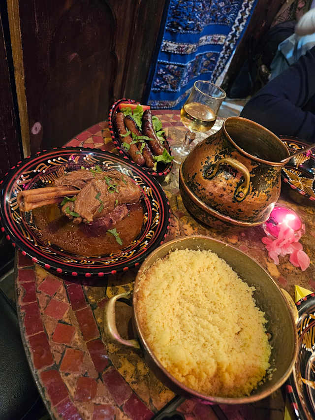 10/10We love this restaurant and they make incredibly tender souris d’agneau (lamb shank) but this time we decided to get couscous. I git the chicken and my partner hit the brochette souk. His was absolutely perfected grilled steak, lamb and chicken. The accompagnement is raisins, chickpeas and harissa. It comes with gently stewed vegetables and copious amounts of couscous. One could split one order for two if you have a modest appetite. Simply order some really nice baklava for dessert. The staff are very friendly and the wine by the glass was robust Moroccan wine. With the discount on the fork the total meal was 42€. We heartily recommend this place for anyone who wants couscous.
