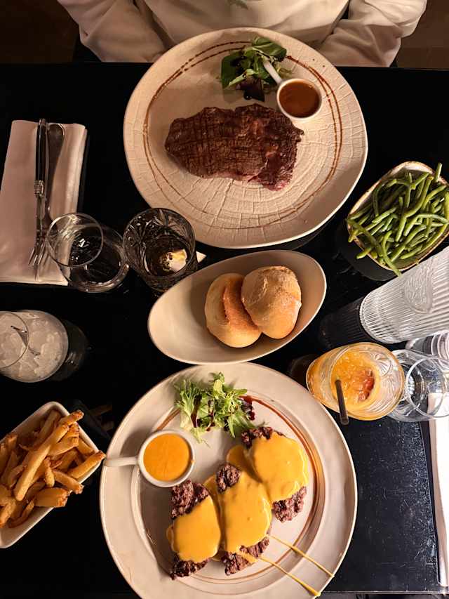 - Steak haché de bœuf Black Angus , tranche de foie gras, salade ,fromages fondu, oignons frits , cornichons