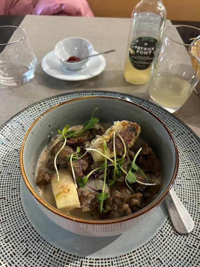 - Blanquette de veau et sa garniture à l’ancienne. Escalope de foie gras de canard poêlée et kasknepfle aux poireaux.