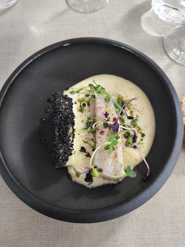 - Lieu jaune confit aux agrumes, céleri braisé pané au sésame noir et hollandaise au citron vert.