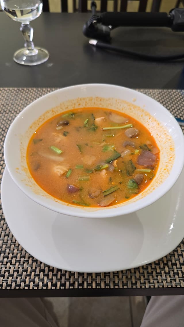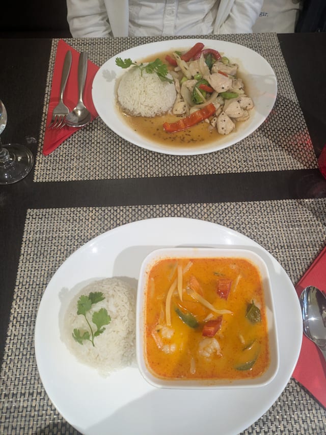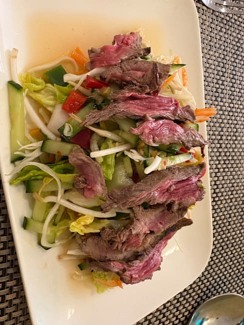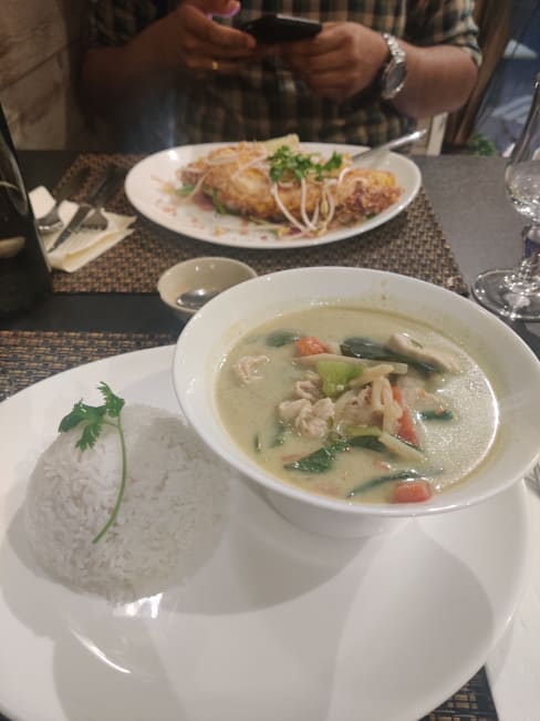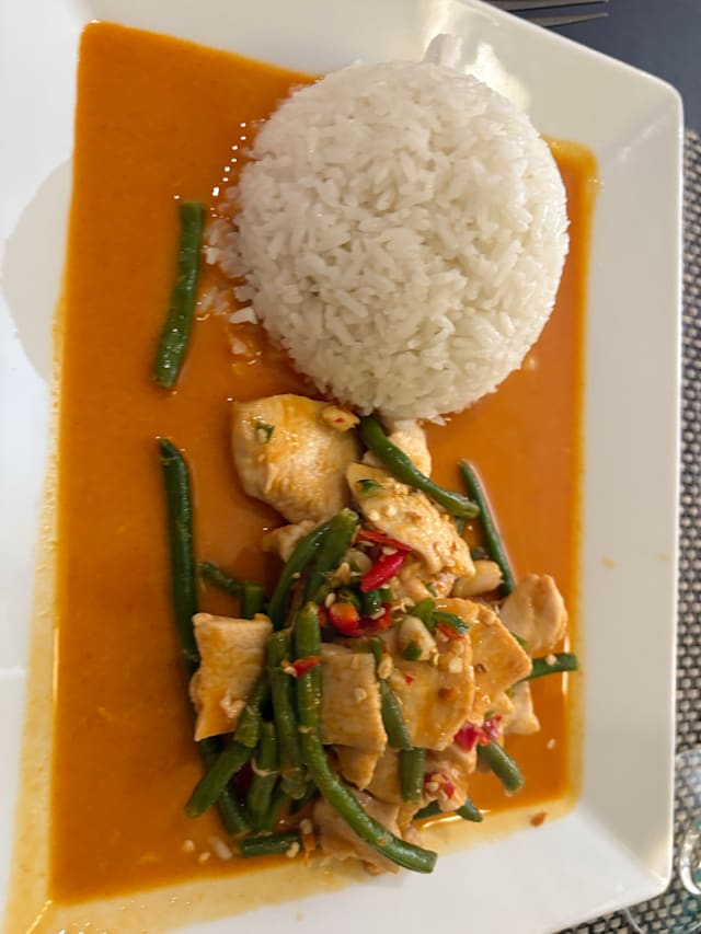 9/10Delicious beef salad with rare beef slices. Red Thai chicken curry cooked extra spicy on my request. Eggy coconut flan for dessert rounded it off perfectly.
