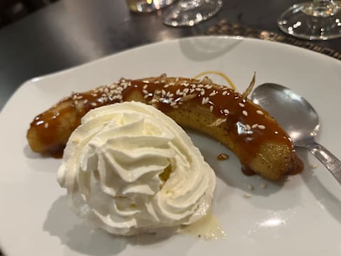7.5/10A good mixed starter platters, fish curry in papillote and caramelised banana. Rose wine from Gaillac region to drink.
