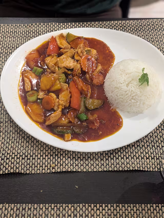 - Porc ou poulet au curry rouge au lait de coco, pousses de bambou, aubergines thaies, parfumé au basilic et feuilles de citron kaffir
