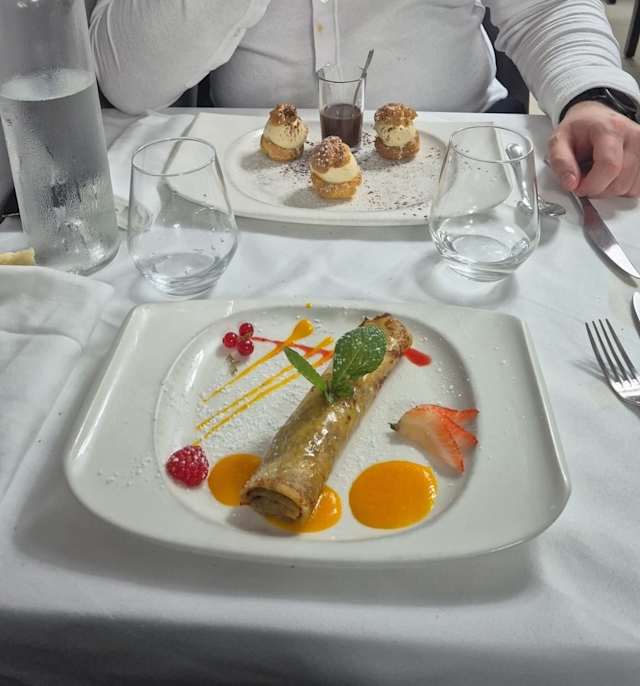 - Crêpes fourrées à l'ananas caramélisées, coulis de mangue