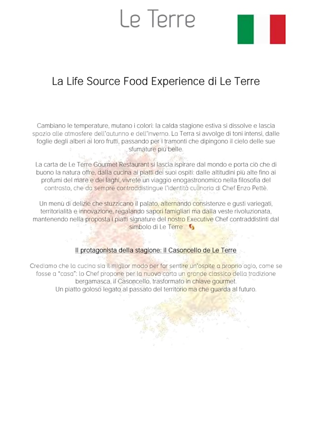 Il vostro viaggio tra luoghi e ricordi, alla volta di sapori contemporanei, inizierà non appena entrerete a Le Terre Gourmet Restaurant. L’eleganza di un gesto in sala, l’essenzialità di una ceramica fatta a mano, la semplicità e l’eleganza dell’ambiente metropolitano saranno una cornice unica dove ...