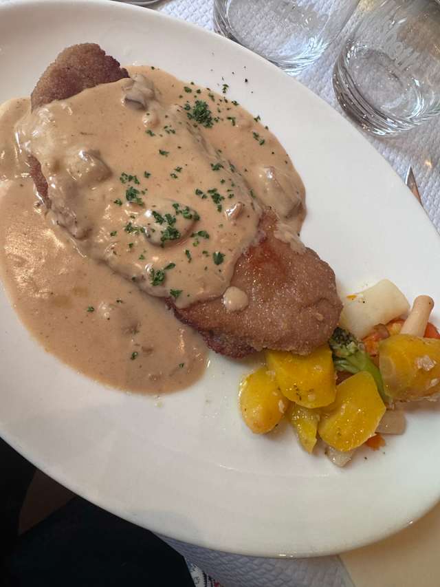 - Cordon bleu de volaille au munster et au jambon de porc, sauce forestière, pommes de terre sautées