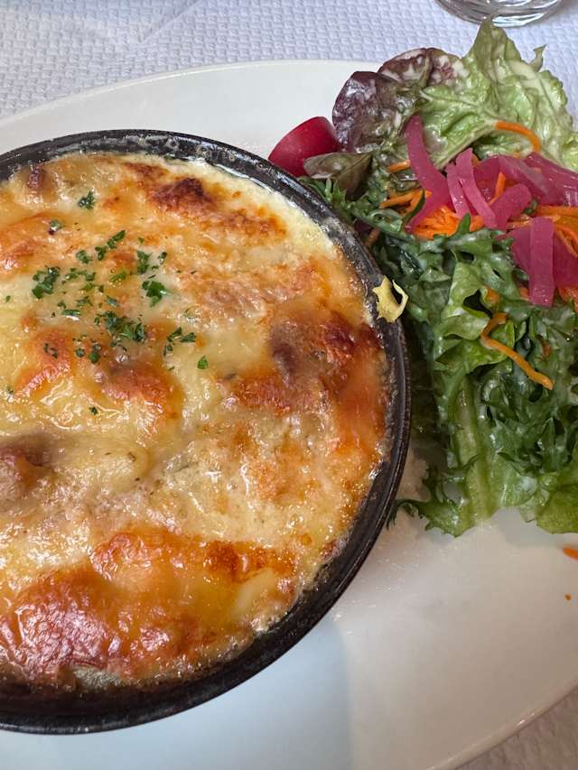 - Munster coiffé (pommes de terre, lardons, oignons, crème), salade verte