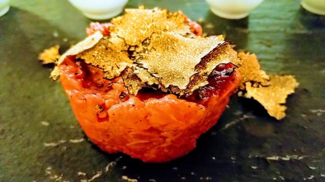 Tartare di manzo con cuuore di bufala e polvere di peperone con riduzione di basilico
