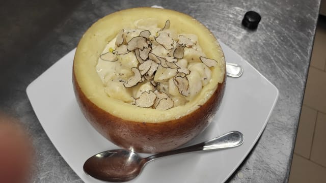 gnocchi fatti a mano serviti nella forma di pecorino e tartufo