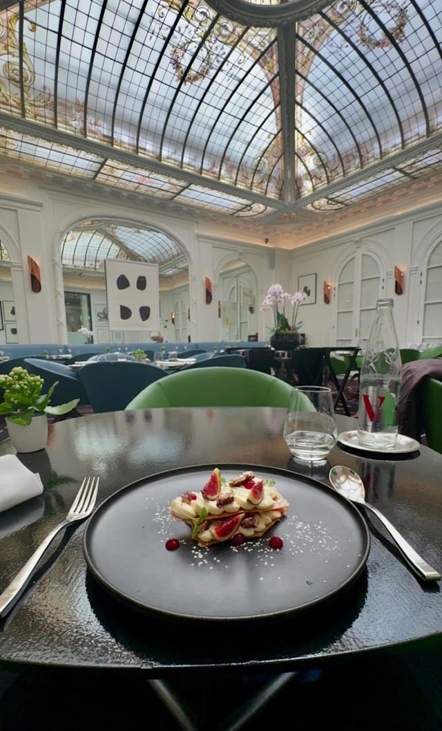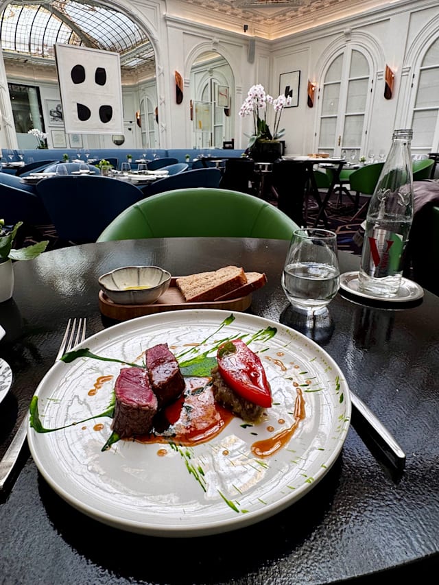 10/10Room has a glass ceiling by G. Eiffel w/ adjoining copper lined celebrity private room (Bee Gees etc). Set meal is spring-themed French Sicilian fusion. Octopus carpaccio plate to start & it opens the palate wonderfully. Thinly sliced cooked pulpo with citrus confit, pomegranate & pea pod tip with tiny avocado cubes; White fish with crispy skin just right & not greasy with pea puréed sauce, tiny clams & roasted broccoli; Barbecued flank steak topped with au jus (meat sauce) with beets, strawberry & pomegranate for the red sweet contrast & tips of fresh pea plants for greens. Strawberry sweetness hits the front palate then recedes into background. The beet purée then commands the field . Steak a little tough but good flavor. Dried yogurt granules are lightly sweetened, grapefruit is added to the yogurt mousse (ice cream consistency) with sponge cake as a base. You have to assemble it on the side of the dish for flavors to pop out. Vermentino; Viognier; Carignan pairing