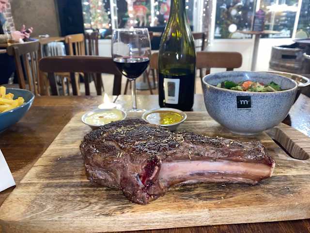 - Entrecôte normande grillée, sauce béarnaise, frites maison, salade