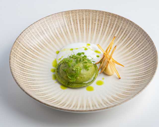 - Raviole au vert, citron confit, crémeux panais nuage d’ail doux