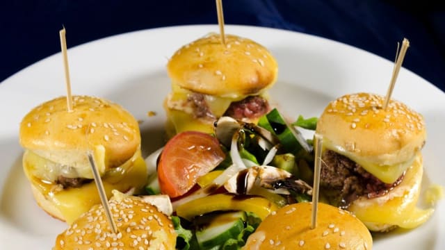 Bœuf, fromage à raclette, tomates, confit d'oignons, salade, jambon de pays, sauce burger. Servi avec salade mixte et potatoes
