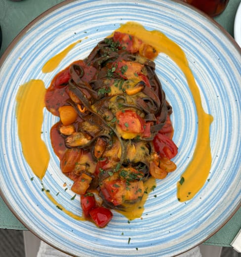 8.5/10Very nice place with view on the harbor. We ordered pizza, buffalo rump and veal cheaks. The pizza was good, the buffalo rump was very deliciuos but the veal cheaks were not good - although the sauce and veggies were very good, the meat was hard and chewy. When we gave that opinion at the counter, adding that we can pay the whole price anyway, we were immediately summed up without this dish and appologised to - so big plus for the very professional reaction to our feedback! Because of that we will come back for sure.