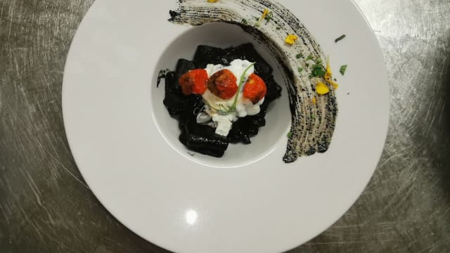Ravioli ripieni di cernia e limone con tartare di scampi, pomodori rossi e gialli e bottarga