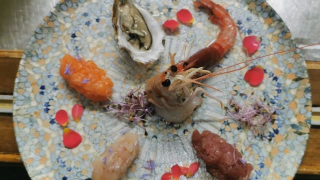 (Scampi 2, gambero rosso 2, gambero viola 2, ostrica perle di andrè 2, tartare di tonno, carpaccio di pesce spada)