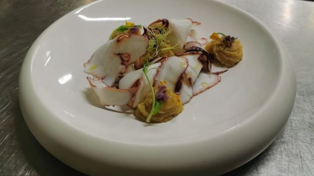 Ciuffo di calamaro alla piastra su insalatina esotica e frutto della passione