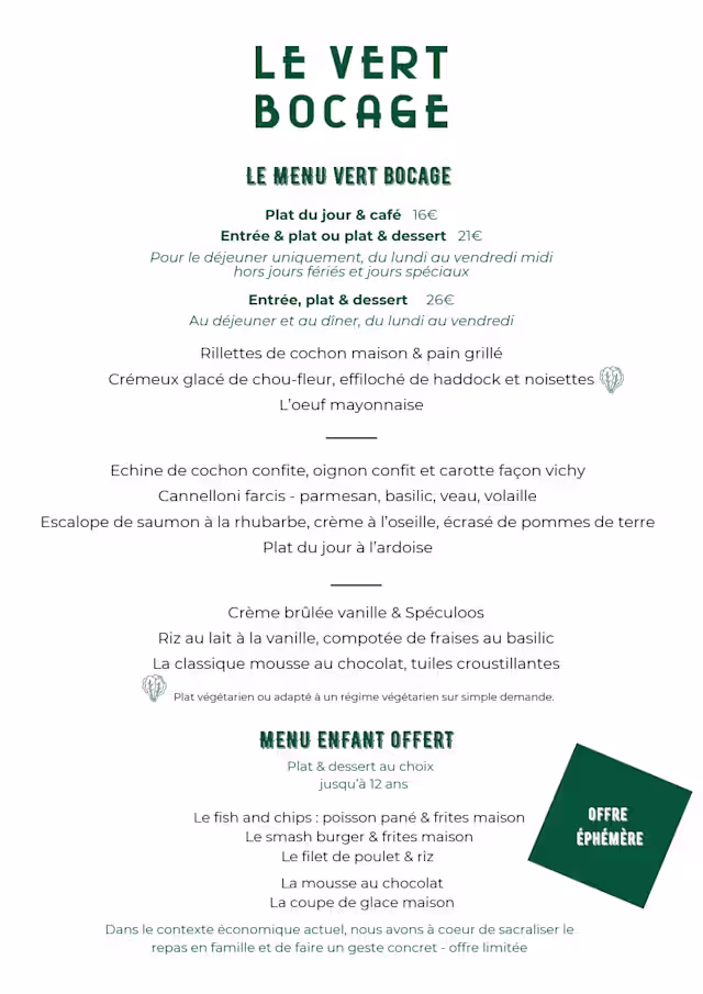 Depuis 1964, le Vert Bocage offre une cuisine traditionnelle reposant sur la qualité de produits frais et locaux. Sur les conseils d’Olivier Da Silva, Chef de L’Odas à Rouen, le Chef du Vert Bocage reprend les classiques de la cuisine française et y ajoute sa propre touche.