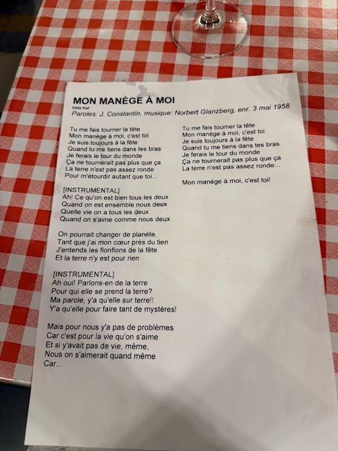 10/10Great fun seemed like a family owned French restaurant with music. The food was great, wine excellent, service phenomenal and the French music of Edith Piaf was so much fun, they even handed song sheets which resulted in everyone joining in