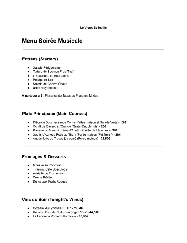 10/10A lovely night of food & music! Paris at its hearty best. Bon Appétit!!