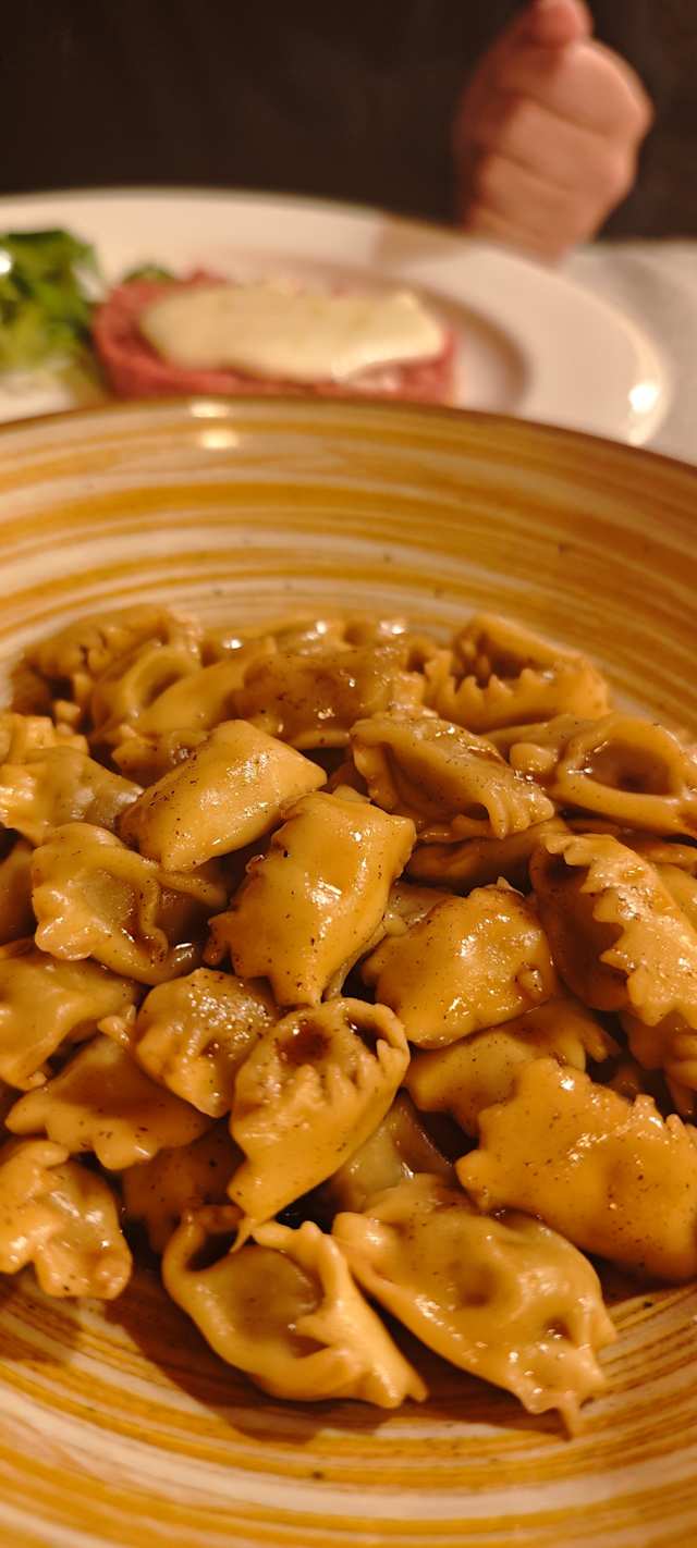 - Malfatti ripieni di salsiccia mantecati al burro con vellutata di peperoni