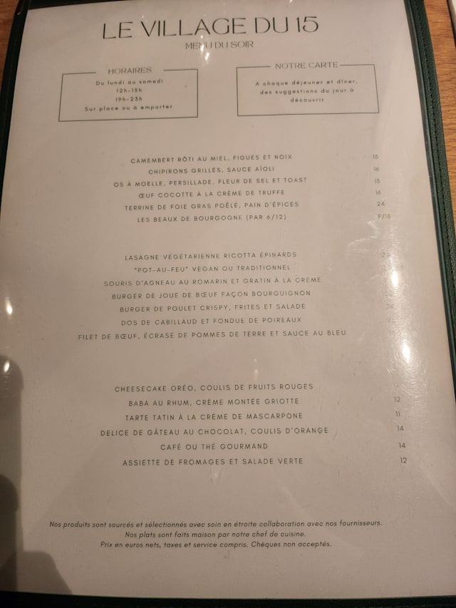 10/10We had a great time at Le Village du 15. As a family of 4, we showed up tired and hungry after a long day. The service was great - they took great care of us and gave my kids extra attention. They even did a half order of escargot so we could try it. Highly recommend.