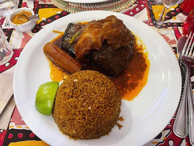 - Ragoût au gombo, huile de palme, crabe fumé, pied de veau et riz blanc parfumé