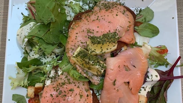 salade verte , tomate, galettes de pommes de terre, saumon fumé