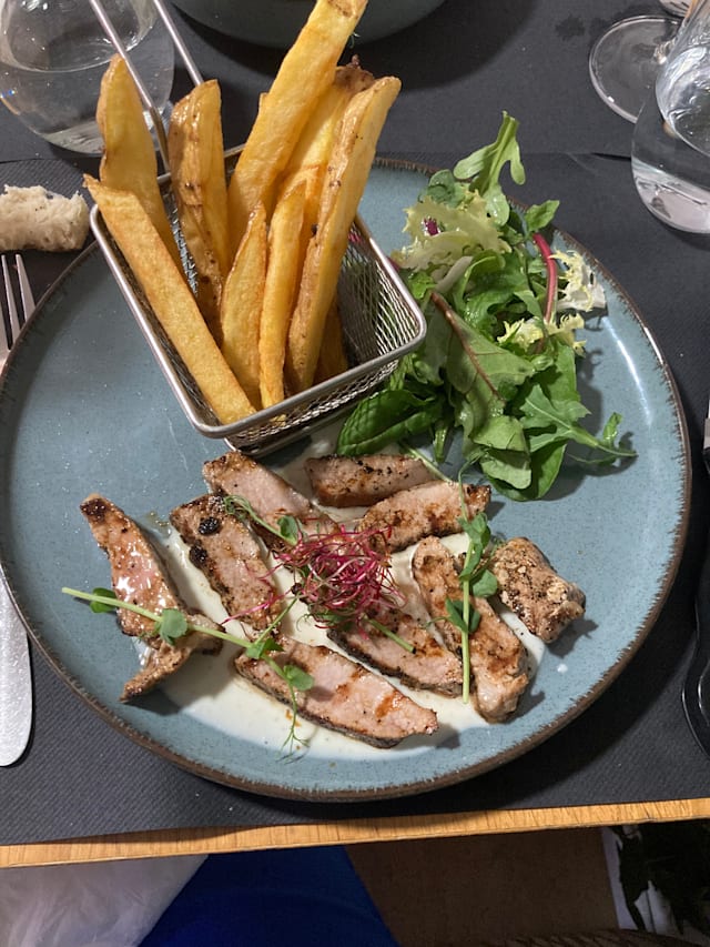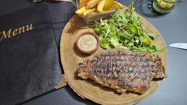 Pièce de bœuf selon sélection du chef d’environ 300grs, sauce maison Roquegort ou mayonnaise wasabi ou poivre vert du Kerala, salade et frites maison