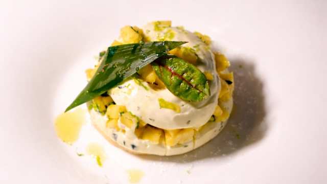 - Tartelette mangue ananas, sorbet passion, pointe de citron vert
