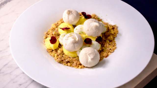 - Girolles poêlés, condiments jaune d’œuf, éclat de bacon de bœuf