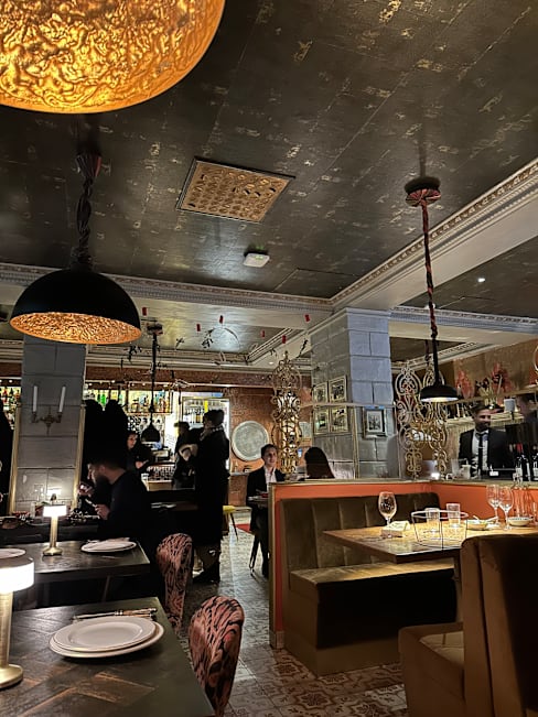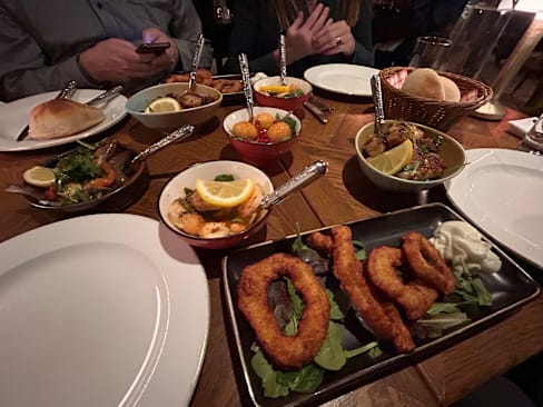 8.5/10A nice restaurant with an elaborate and elegant interior. This was a busy evening and the dining room was almost full with new guests filling up as tables were cleaned. We are different tasting menus consisting of mixed cold appetizers, warm appetizers and a grill plate, all was to share among the four of us. The food was well presented and tasty. The hot appetizers were too dry for our taste and we would have appreciated a sauce or something to have with these dishes. There were plenty of waiters and they were alert and readily available to help guests. The service was quick and efficient, all in all a nice evening out.