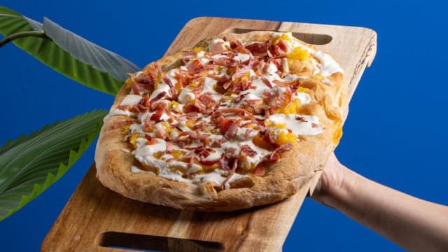 Base focaccia, pesto di basilico, coulis di pomodoro fresco e bufala