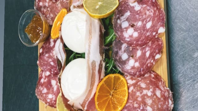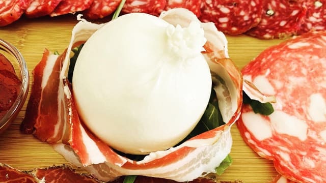 Mozzarella, pesto di pistacchio, mortadella e granella di pistacchio.