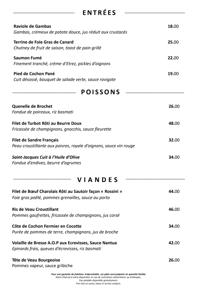 8.5/10We were 14 guests which made the booking a little complicated, but went on well after some communication in english. The Olympia Menu was very good, but the Bresse Chicken was served without any raffinement, in a very large porsion. Perfect wines suggested by our waiter, and the service was excellent the entire evening. We recommend this very nice restaurant.