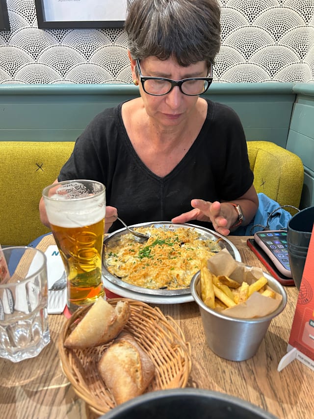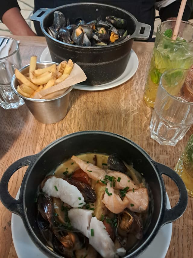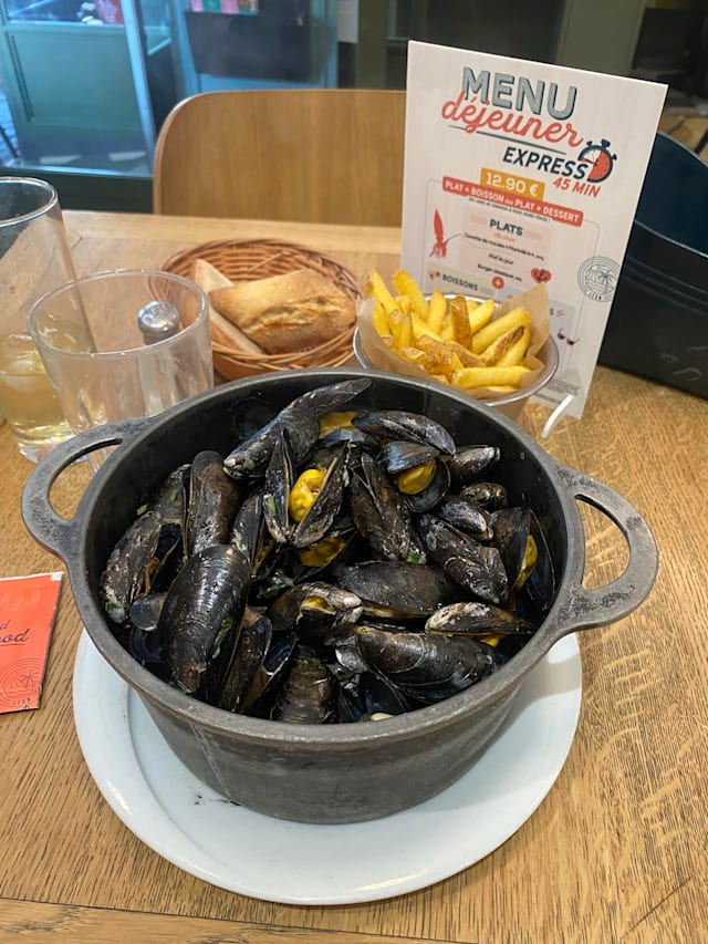 7/10We had the formule menus, which were great value at 20 euros per person for entree, main dish, a glass of wine and bread. We had the moules frites for main dish, which were very good. One of us had an entree, which was a moule stew (can't remember the name) - very good. The other of us had ile flottante desert, which was OK, but not amazing. The service was good and efficient. The atmosphere was good, with a friendly upscale fast food vibe. The location is superb (a few minutes walk from Beaubourg), and it's open until 22:30, so this is a good address.