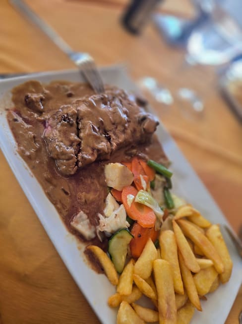 6/10Not what we expected at a rating of 8.7, it was above average at best. When we were ready to order from the menus, the waiter replied that the chosen main courses was not included in "The Fork"; only dishes for less than €23 and NO desserts. His phone showed that offer only included a “preset menu” & excluding desserts. We asked for the “preset menu” but there were none to show!? After a short argument the waiter blamed “The Fork” and I asked why without getting an answer!? The “first impression” didn’t stop there, the food for the group of six was a “hit and miss” - for some delicious for others not so. Ex. The Sirloin steak Béarnaise sauce was curdled (a decent restaurant wouldn’t have brought it in) and the Tournedos wasn’t made from the best part of the tenderloin. The service was average, waitresses rather busy & not as attentive as you would expect for an ≈€25 dish restaurant. In overall it was an ‘OK’ experience but I wouldn’t recommend a visit for friends & family.