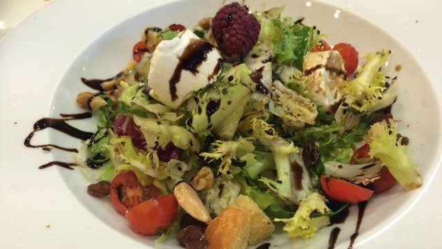 Mezcla ensaladas, aguacate, pimientón rojo, verde, tomate cebolla i vinagre de módena