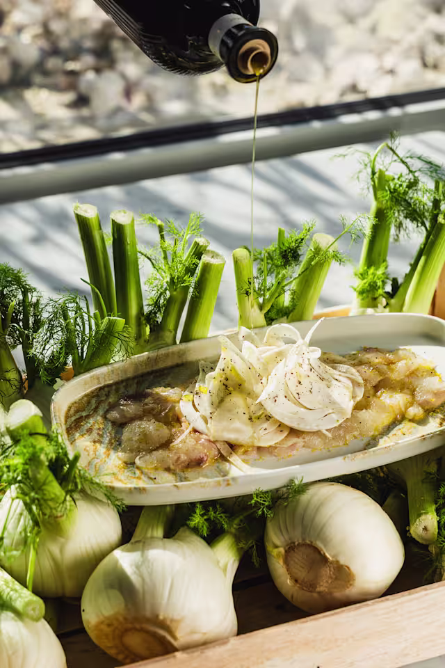- Poutargue, huile d’olive citronnée & salade de fenouil au sumac